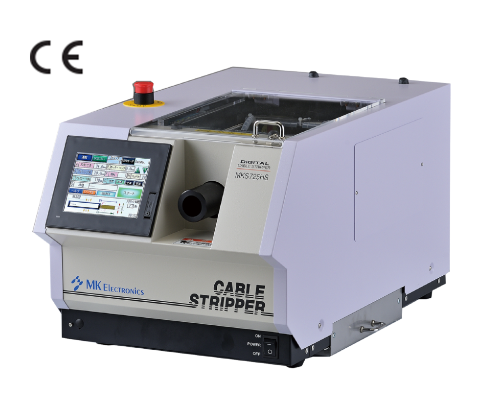 加工外径φ4~24mm刃物が回転しながらケーブルに切り込みを入れる回転刃ストリップ機。切り口が非常に綺麗に仕上がります。