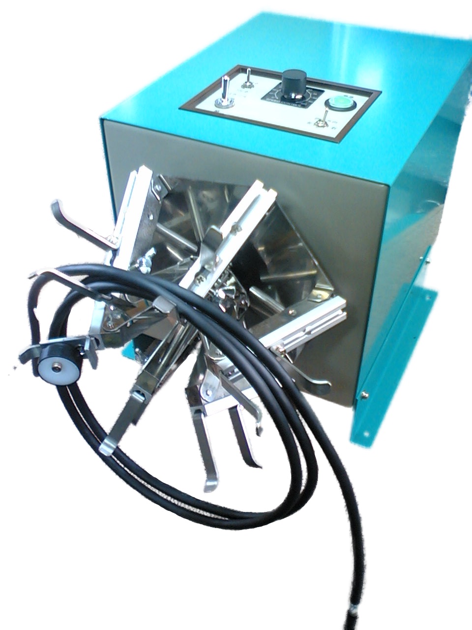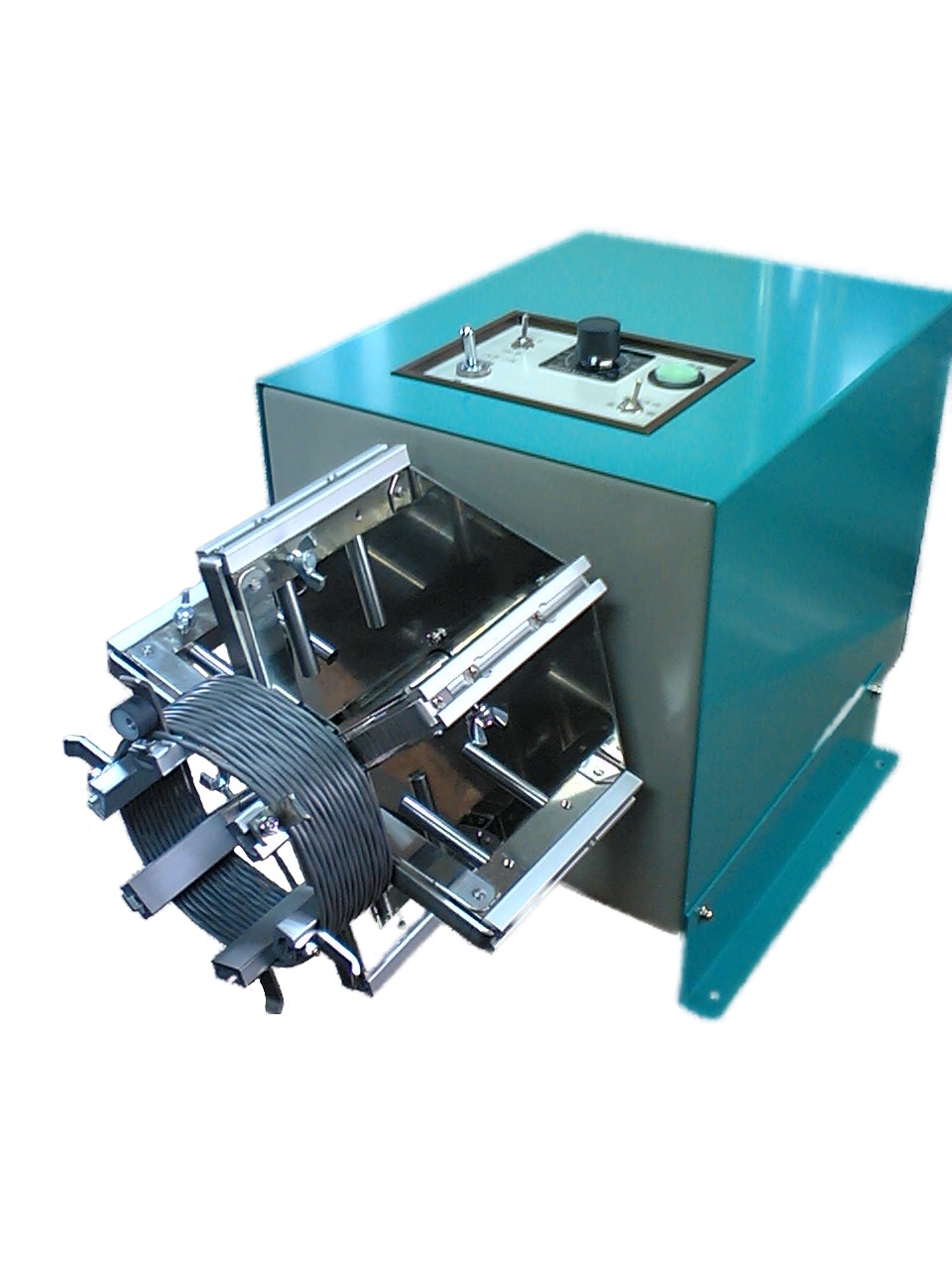 電動開閉パラソル搭載ケーブル巻取機です。ケーブル外径φ15mmまで巻取り可能、内径可変・巻取り幅可変可能です。ケーブルのクランプを差込式とすることで作業性を向上させした。フットスイッチにより、ON/OFFや回転スピードのコントール機能・2段階のパラソル開閉機能などが搭載されています。
